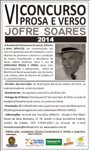 A Academia Palmeirense de Letras, Ciências e Artes – APALCA – está com inscrições abertas para o seu VI concurso literário, que neste ano homenageará o ator Jofre Soares, que participou em filmes como Vidas Secas (1963) e Dias melhores virão (1986).