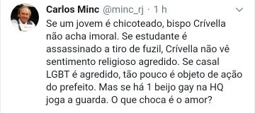 No Rio de Janeiro, o governador sobrevoa comunidades pobres atirando em cidadãos e provocando o terror em cidadãos, principalmente crianças. Na capital, o bispo e prefeito manda autoridades municipais censurar obra literária para “proteger as crianças e adolescentes” – o prefeito invadir a Bienal do Livro para censurar o livro é a maior prova que o Brasil vive o início da era de censores, agora com o acréscimo que esses sensores são também “religiosos” da Igreja Universal do Reino de Deus.