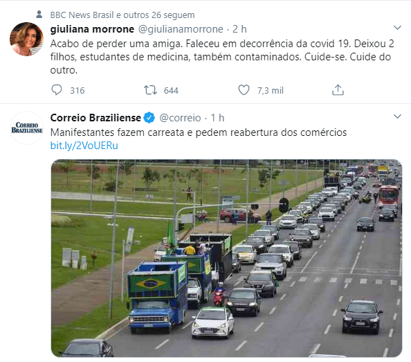 | Foto: Tuítes mostrando os dois lados da situação brasileira. |